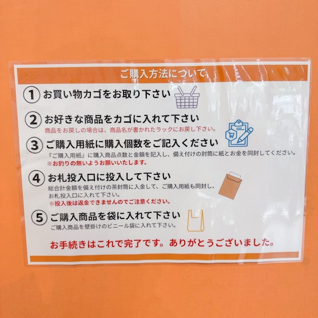 購入用紙の隣に備え付けの封筒があるので、購入用紙とお金を入れて、このお札投入口に入れると購入完了です!