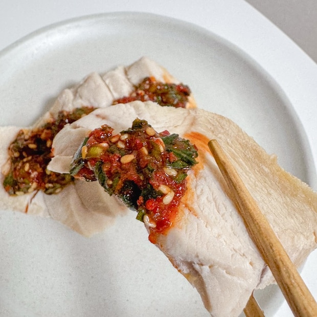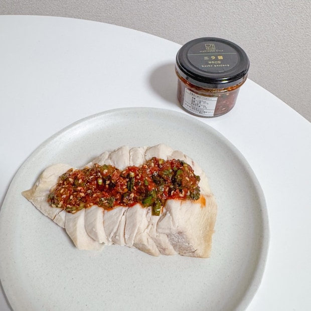 しっとりとした蒸し鶏のやさしい旨みに、香り高いニラ醤のコクとパンチが絶妙にマッチ。