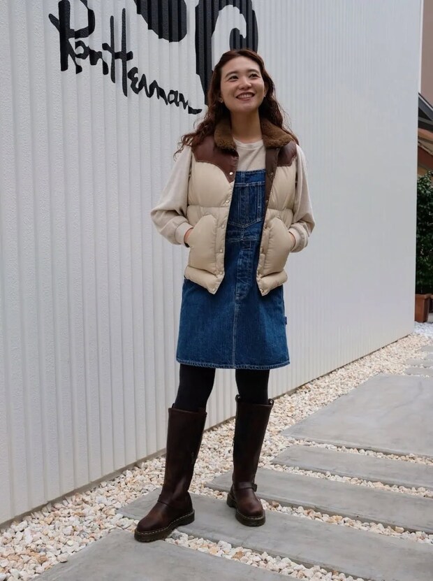 ベスト¥94,600(Rocky Mountain Featherbed)、シャツ¥45,100(スージー コンディ)、オーバーオールスカート¥36,300(RHC/全てRHC Ron Herman)、ドクターマーチンのシューズ、ティファニーのアクセサリーは全て本人私物
