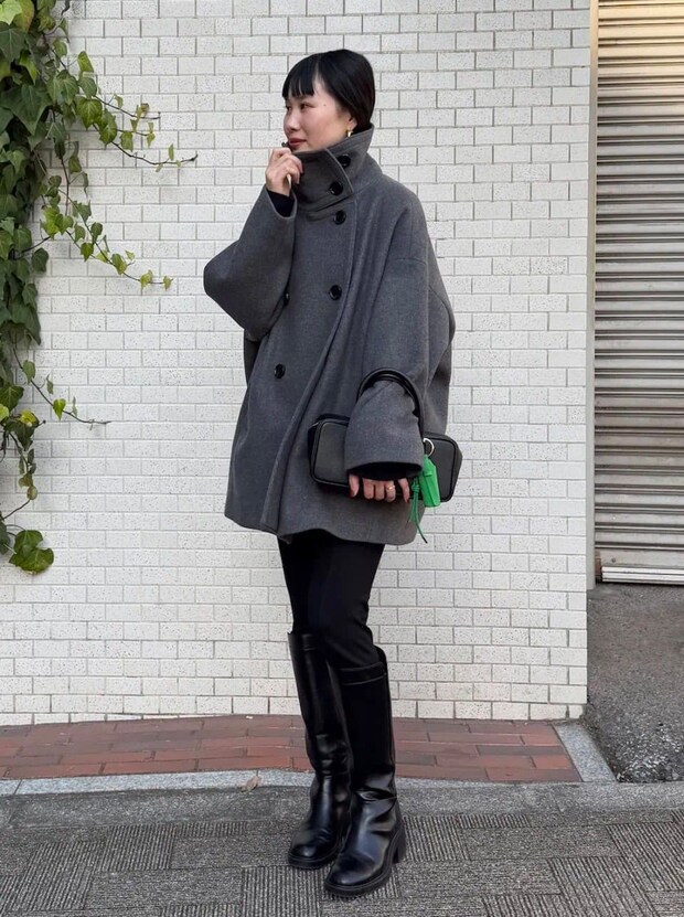 昨今ボリュームのあるパンツのトレンドが続いていますが、細身のパンツやレギンスをブーツインするスタイルもやっぱり素敵ですよね。特にトップにボリュームを持ってくる場合、ボトムをコンパクトにすることでコーデ全体がスッキリと見え、スタイルアップも叶います。ボトムとブーツをブラックのワントーンでまとめると引き締め&脚長効果も!