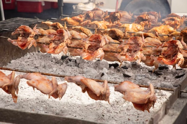 少し足を伸ばしてハレイワ方面へ移動。ホノルルからおよそ1時間車を走らせて向かったのは、土日限定で営業をしているフリフリチキンのお店【レイズ キアヴェ ブロイルド チキン】。フリフリとはハワイ語で“回す”を意味する言葉。特製スパイスをきかせた醤油ソースで鶏肉を一羽丸ごと味付けし、長い串に刺したら炭火の上で回転させて炙り焼きをする、というシンプルな調理方法です。