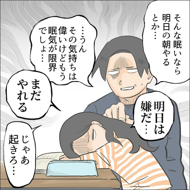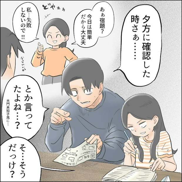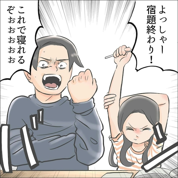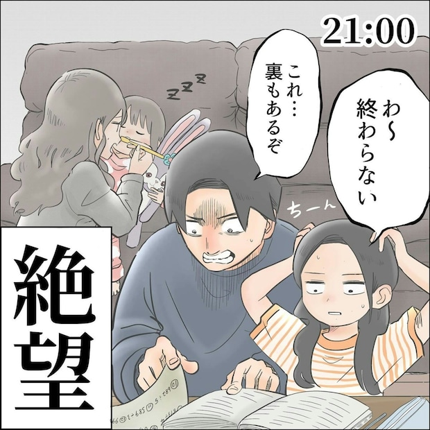 1時間以上かけて終わらせた宿題が、まだ終わっていなかったなんて…。容赦なくパパを置いていってしまった長女は、もう眠気の限界だったようです。がんばって宿題を終わらせた長女を怒ることもできず…こんなことがあるなんて予想もしなかったパパの悲壮な表情が切ないですね。