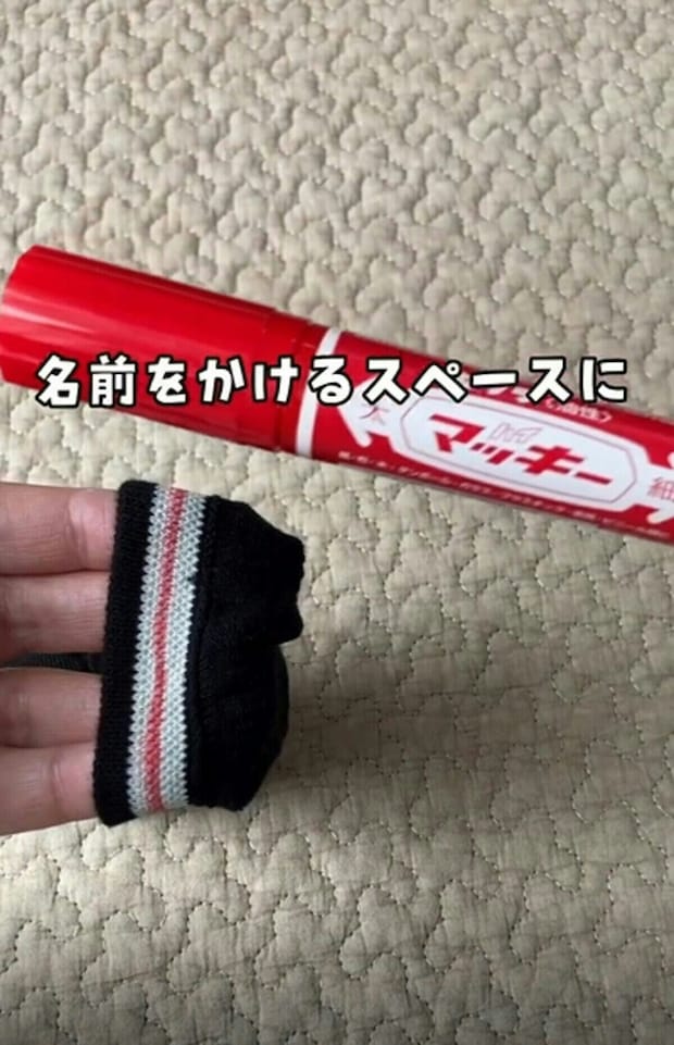 靴下の内側の名前を書くスペースに沿って、油性ペンでぐるっと一周、線を引きます。