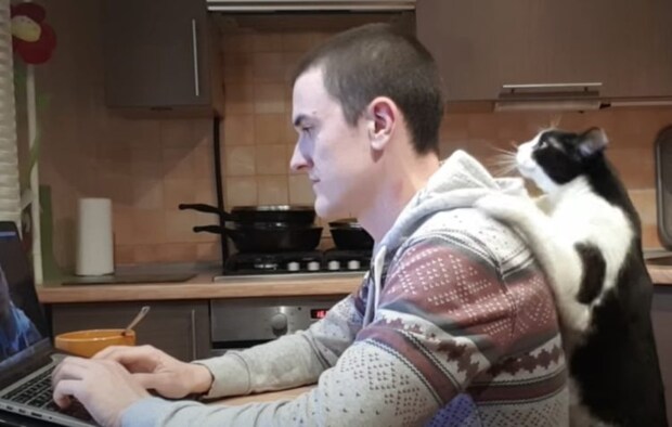 パソコンに向かって作業をしている飼い主さん。