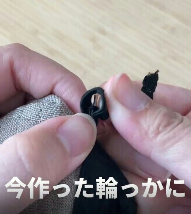 作った輪にゴムを通して、結びつける