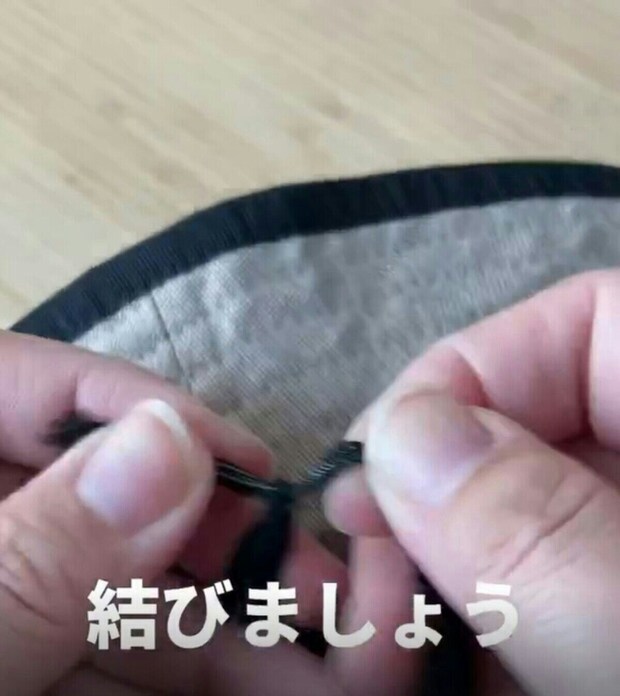 元々、あごゴムが付いているタイプの帽子は、1回切って輪っかを付けるとのこと。