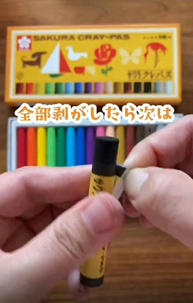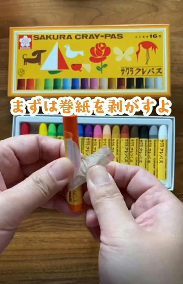 まず、クレヨンに巻かれている巻紙を1つ1つ剝がしていきます。