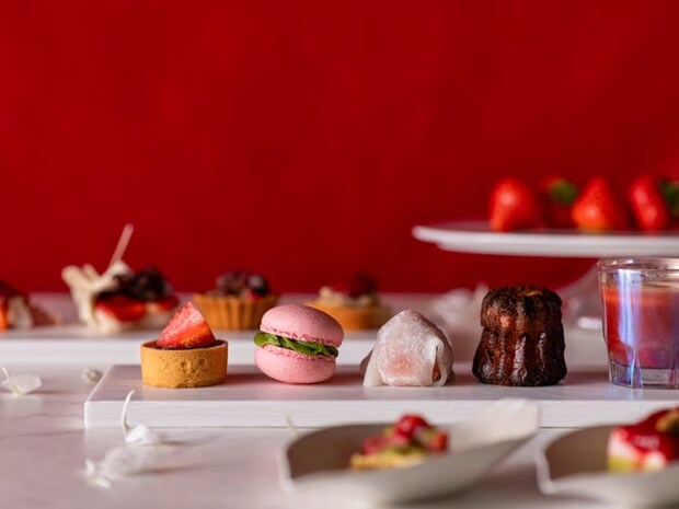 甘酸っぱいいちごを主役に、和と洋の要素を織り交ぜたスイーツが並ぶ「いちご尽くしのアフタヌーンティー」。「苺スープ」や「苺大福」、「ピスタチオと苺のムース」など、さまざまな素材と組み合わせたバリエーション豊かなスイーツたちが、華やかなティータイムを演出。ほうじ茶や抹茶を取り入れた香り高いスイーツも用意されるので、一つひとつじっくりと味わってみて。