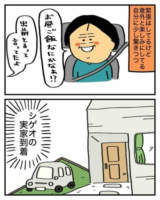 緊張はしているけど楽しみにもしている自分に驚くエクボさん。車はシゲオさんの実家に到着しました。