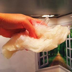 2.水分が出てくるので、端の部分を少しだけカットしましょう。あとはギュッと握ったり絞ったりしても破れにくいので、存分に水切りできるんです!