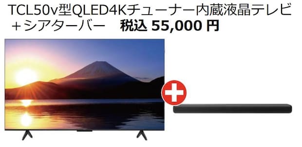 ・TCL 50v型QLED 4Kチューナー内蔵液晶テレビ+シアターバー:55,000円(税込)トゥルースリーパーマットレス+まくら2点セット:11,000~15,400円(税込)