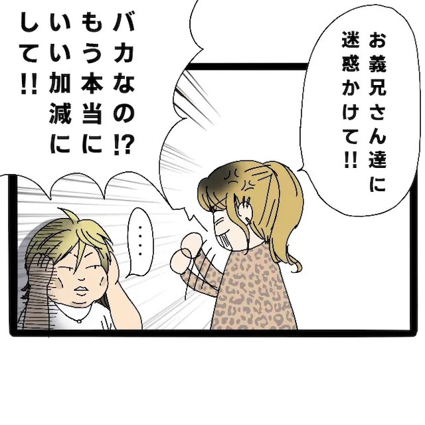 「お義兄さん達に迷惑かけて!!バカなの!?もう本当にいい加減にして!!」サチさんは周りの迷惑も考えず自分が夜のお店に行くことしか考えていない信也君を責め立てますが、耳を塞いで他人事のように目を逸らしている信也君。あ・・全く響いてなさそう。
