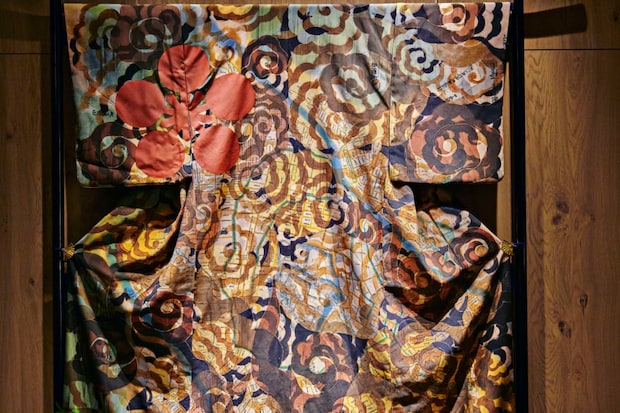 衣桁にかかっている着物には、近くで見ると金沢の古地図が下刷りされているんです。こうして間近で楽しめる作品が館内の随所に配置。
