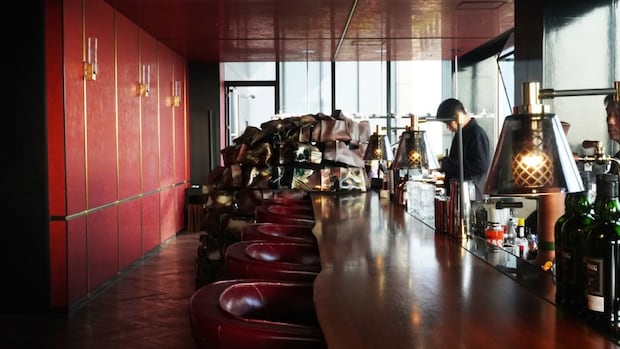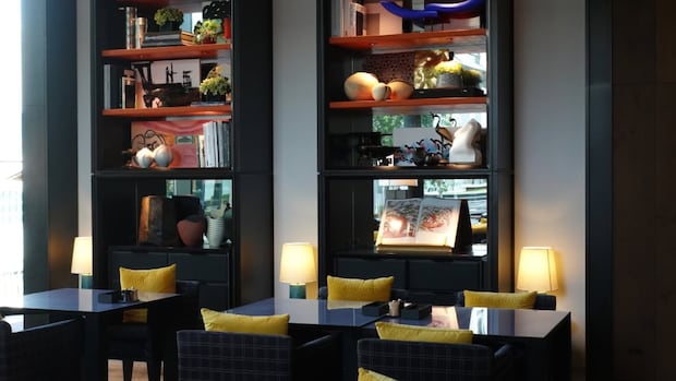 レストラン「FIVE – Grill & Lounge」にて。壁にもぎっしりと展示された作品たち。