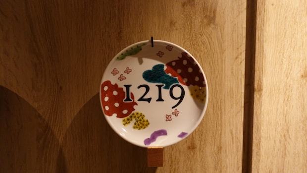 お部屋のルームサインは九谷焼。エレベーターホールからお部屋に向かうまで、すべて異なるデザインになるように配置されているそう。彩り豊かな作品の中からお気に入りを探してみるのもいいですね。