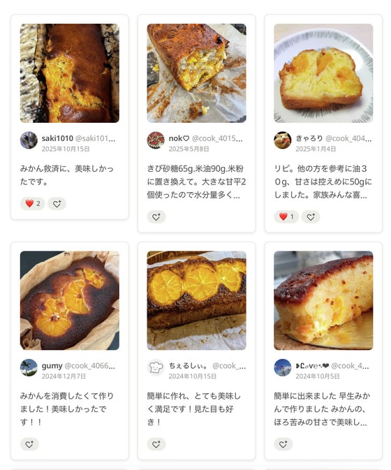 実際にこのレシピで作った人の感想つくれぽ(つくりましたフォトレポートのこと)にも「みかん救済に作りました!おいしかったです」「簡単においしく作れて嬉しい」「みかんのさっぱりした甘みが楽しめるケーキでした」などの嬉しい声が100件以上も届いています。