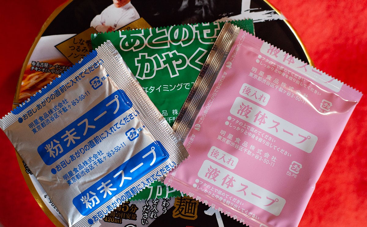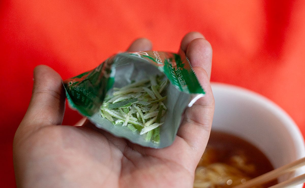 この商品の大きな特長は、2通りの食べ方があるということ。まずはそのまま麺とスープだけを味わい、途中から千切りねぎを加えて香りと味の変化を楽しむ、というのがおすすめの食べ方のようです。実際、3つの小袋はすべて「後入れ」となっていました。