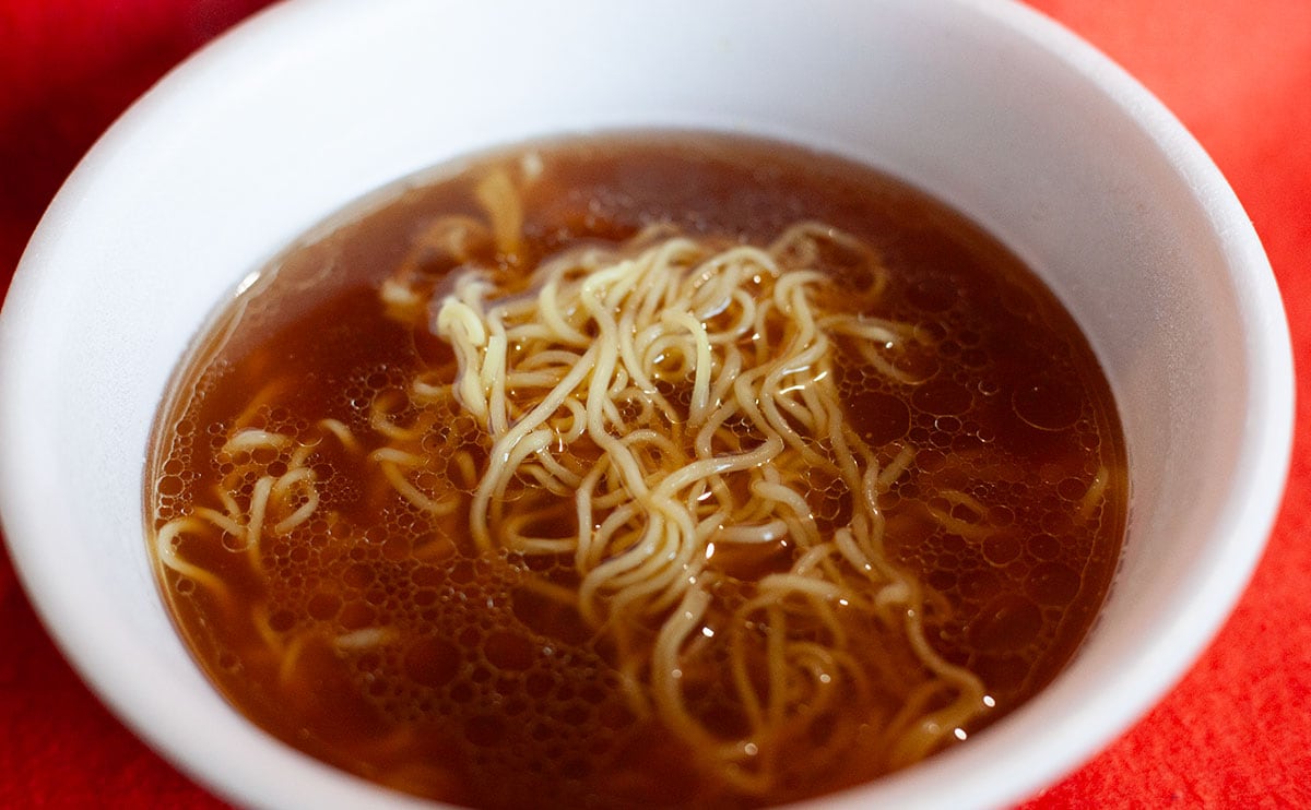 そのため、何も入れずにお湯を注げばOK。5分待って、「粉末スープ」と「液体スープ」を入れます。そして、完成したのがこちらです。超シンプル!