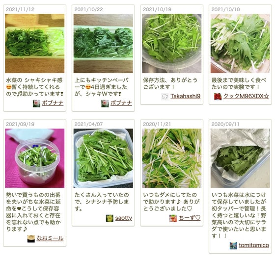つくれぽ(作りましたフォトレポートのこと)にも「簡単で長持ち!シャキシャキでおいしい」「いつも使い切るのが大変でしたが、これで使い切れます」「凄い!4日目でもシャキシャキ!これでしなしなとサヨナラだわ」などとシャキシャキ感に感激の声が多数。「長持ち保存だけでなく、食べたいときにすぐお皿に盛れて便利」という声も。