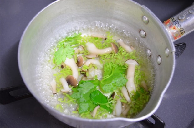 1人分あたり水100mlに鍋スープを大さじ1を入れ、余った具材(今回はしめじと三つ葉)を加えてひと煮立すれば完成です。