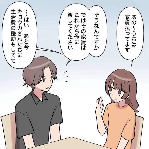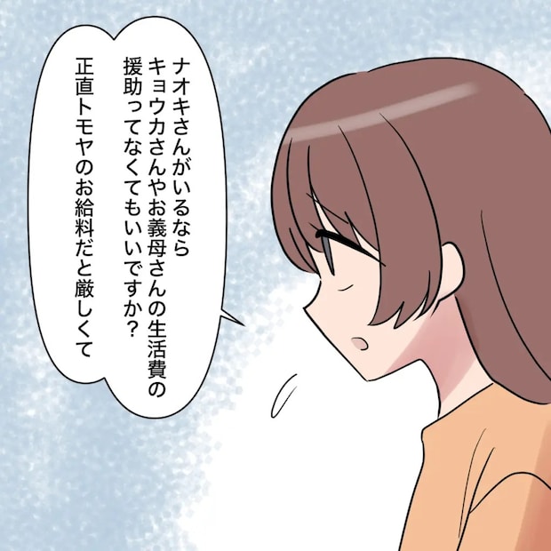 ナオキさんは、キョウカさんには「1か月以内に仕事と保育園を探すこと」、義母には「キョウカさんが求職中の間は子どもたちの面倒を見ること」、さらに「保育園が決まったら仕事を探すこと」を指示しました。これで正真正銘、キョウカさんたちの援助をしなくてよくなる!心の中で喜んでいると、トモヤが「で、でも、僕は生活費の援助は続けてもいいと思うんだ、アヤノいいよね?」と言い出しました。