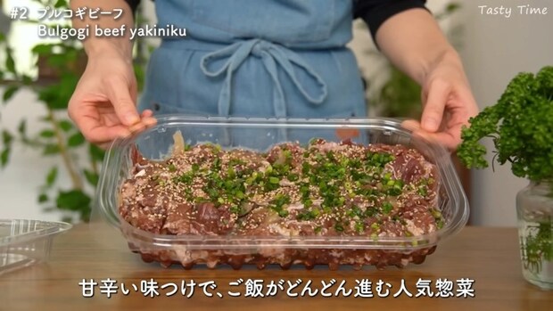 牛肉を醤油ベースの甘辛ダレに漬け込んだ「プルコギビーフ」。フライパンで炒めるだけで、ごはんがすすむメインディッシュができあがります。