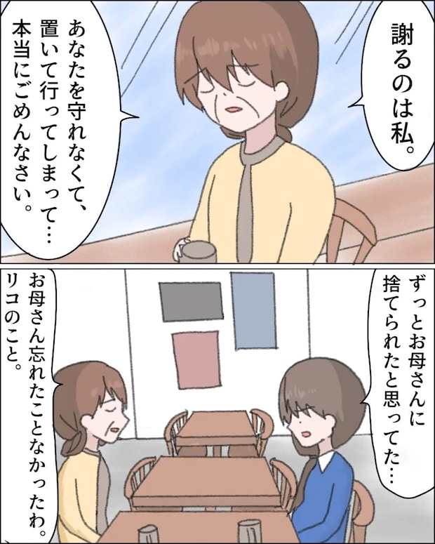 すると、「謝るのは私。あなたを守れなくて、置いて行ってしまって・・本当にごめんなさい」お母さんが謝り、「ずっとお母さんに捨てられたと思ってた・・」と言うと、「お母さん、忘れたことなかったわ。リコのこと」とお母さんが言ってくれました。