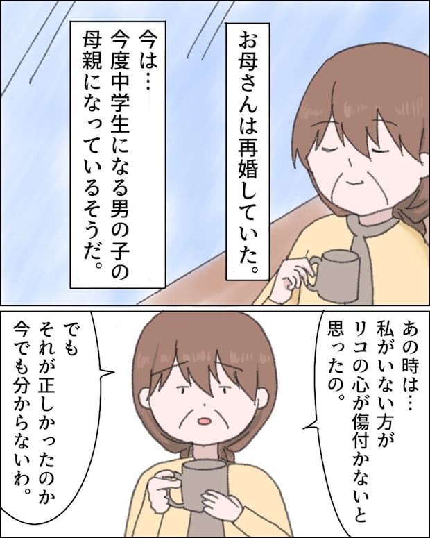 「あの時は・・私がいない方がリコの心が傷つかないと思ったの。でもそれが正しかったのか今でもわからないわ」とお母さんが家を出た時のことを話してくれました。