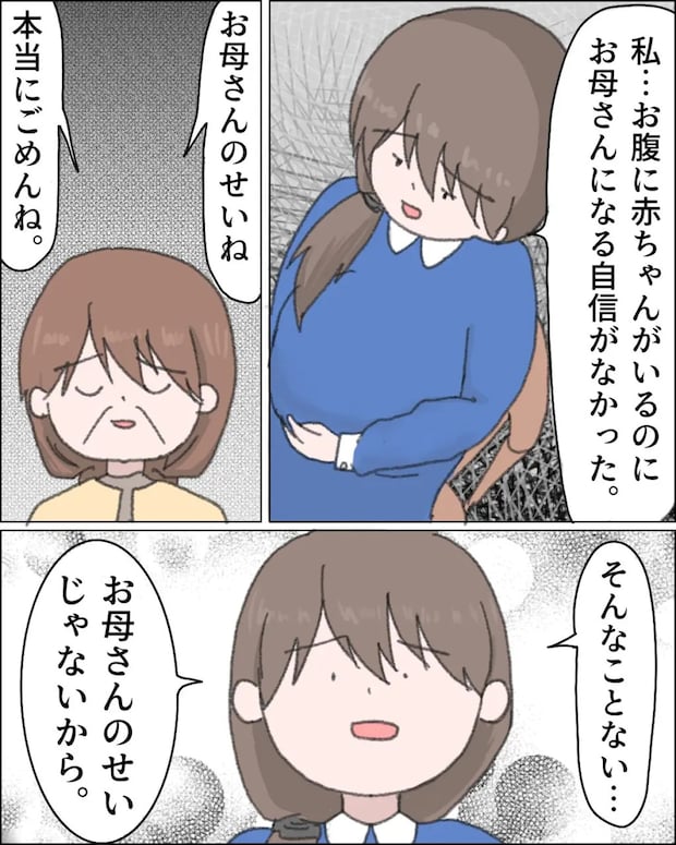 そして「私・・お腹に赤ちゃんがいるのに、お母さんになる自信がなかった」そう言うと、「お母さんのせいね、本当にごめんね」と謝るお母さんに、「そんなことない・・お母さんのせいじゃないから」と真剣に伝えました。