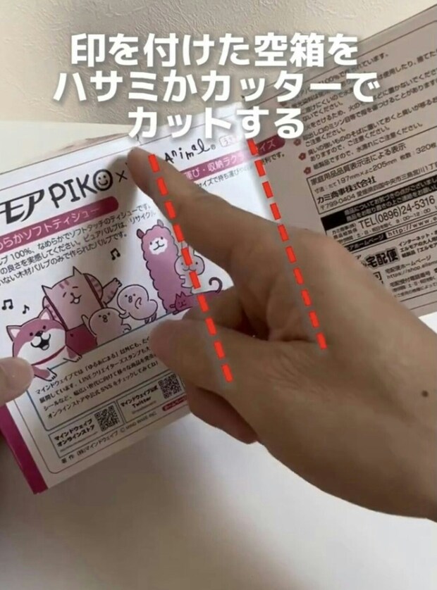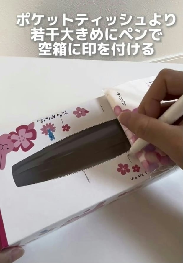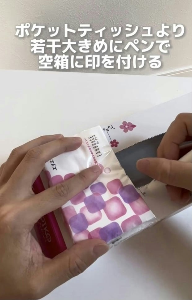 空き箱の左右に順番にポケットティッシュを置き、少し余裕を持って印を書いておきます。
