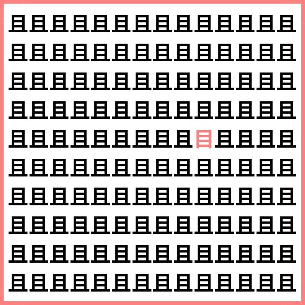 たくさんの「且」の中に、1文字だけ違う漢字が混ざっています。