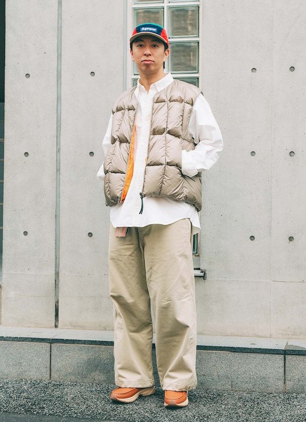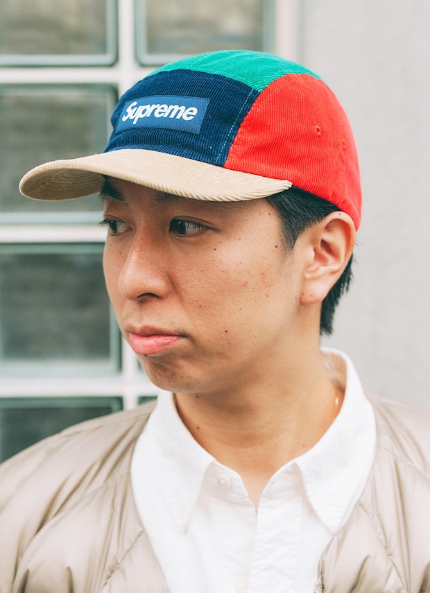 『シュプリーム』のカラフルなキャップがストリート感を演出!! ベージュトーンでまとめた装いに、映えるアイテム。
