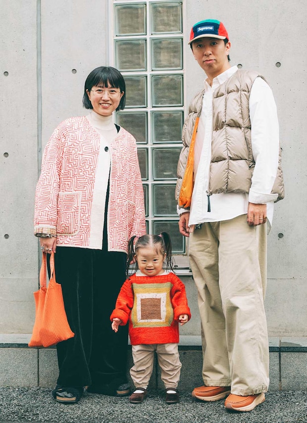 ママのアウター、パパのキャップ、キッズのトップスとひと癖あるアイテムを引き立てた家族コーデは、ほかを抑えてバランスを取ったのがお見事! みんなでベロア素材や暖色カラーをポイントでシェアして、しっかり統一感を演出したのがグッド♪