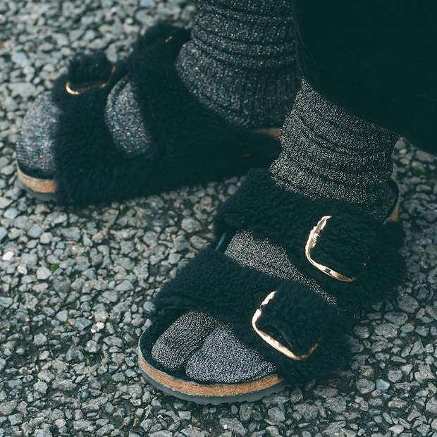 『ビルケンシュトック』のサンダルはボア素材で冬モードをオン! ラメソックスを合わせた、冬でも足元から遊び心を忘れない。