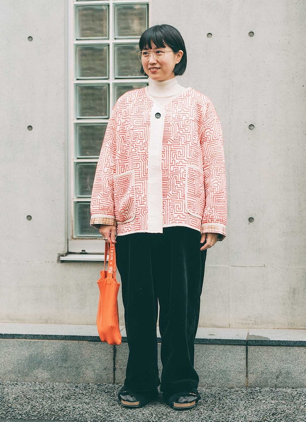 ダブルブリッジのメガネとクリーンなホワイトタートルで知的な雰囲気に。アウターがより引き立つアイテムセレクトはお見事!