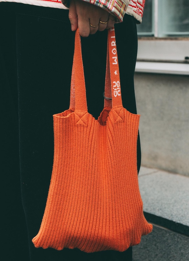 鮮やかオレンジのバッグでビタミンチャージ! 持ち手のロゴが、ポップなアクセント役に抜擢♪