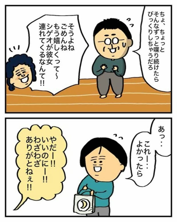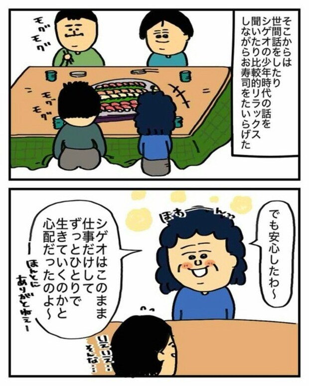 息子が彼女を連れてきたことをとても喜ぶシゲオさんの母。実は「シゲオはこのまま仕事だけしてずっとひとりで生きてくのかと心配だったのよ」と息子のことを心配していたのでした。
