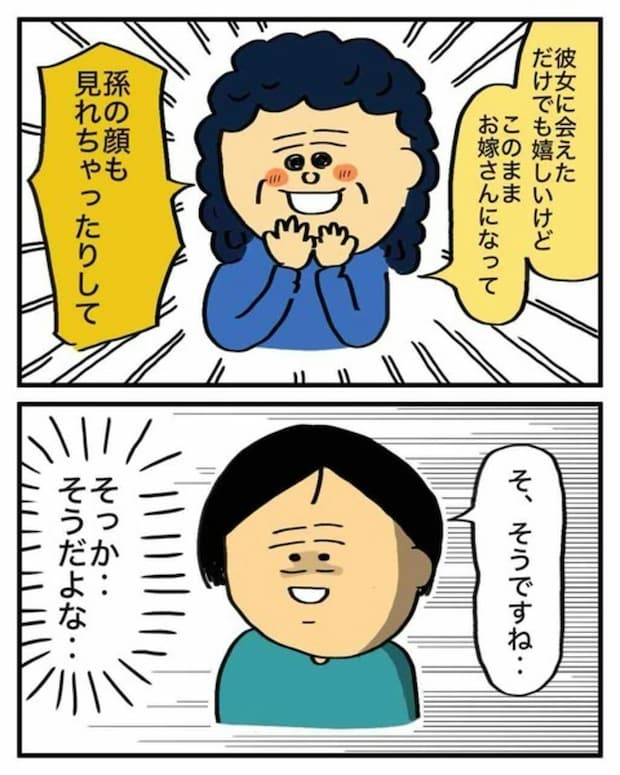 つづけて「彼女に会えただけでもうれしいけど、このままお嫁さんになって、孫の顔も見れちゃったりして」と目を輝かせるシゲオさんの母に、エクボさんは…。