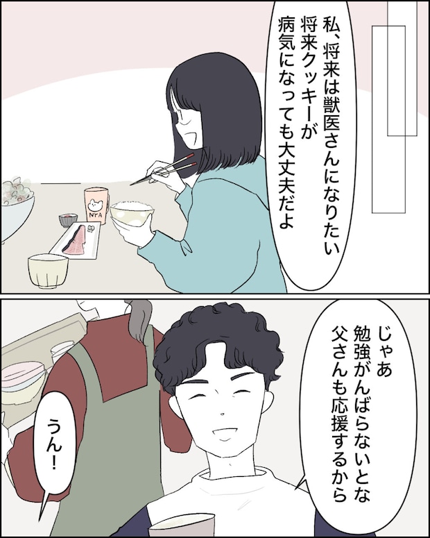 ある夜、歩実が「私、将来は獣医さんになりたい。将来クッキーが病気になっても大丈夫だよ」と将来の夢を教えてくれました。「じゃあ勉強がんばらないとな。父さんも応援するから」と博之が言うと「うん!」と嬉しそうに答えた歩実。