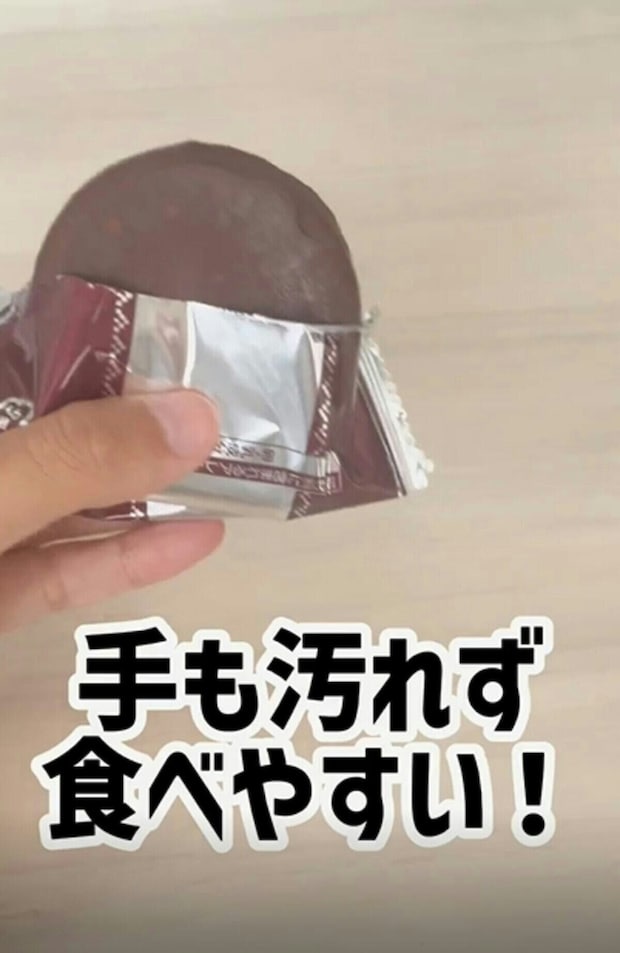 この開け方だと、パッケージを持ったまま食べることができるので、手を汚すことなく食べることができますね!