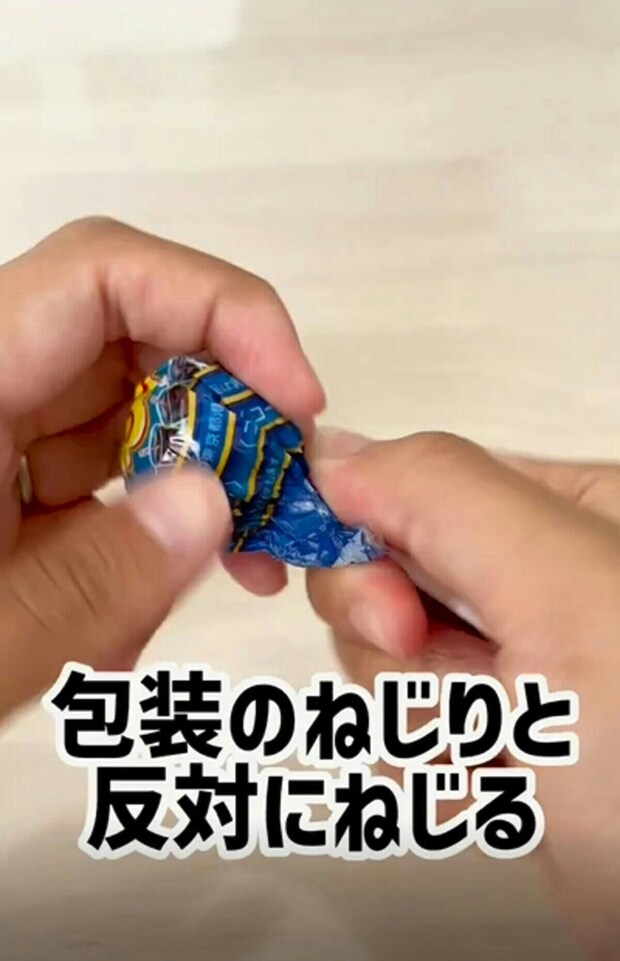 まず、どちらの向きに包装がねじられているか確認します。そして、その向きと反対の方向にねじります。