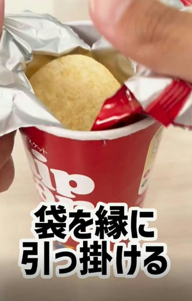 ポテトチップスが少なくなってきたら、袋を引っ張ることで、常にポテトチップスが食べやすい位置に。