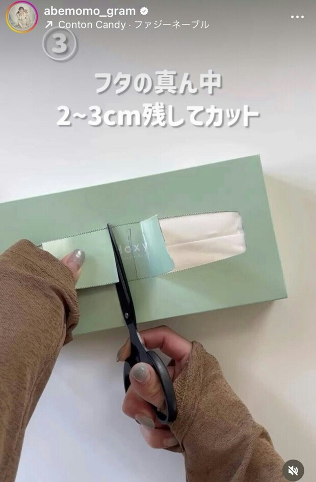 ティッシュのふたを全部開けずに、真ん中を2~3㎝残して両端をハサミでカットします。