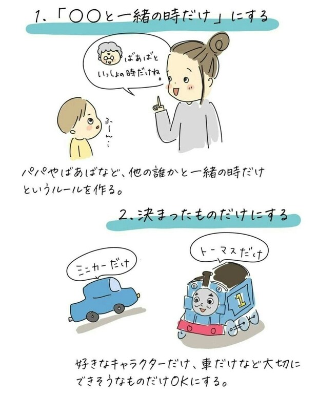 子どもが好きなものだけというルールを決めるとの声も。例えば車が好きならミニカーのものだけ、トーマスが好きならトーマスのシリーズのものだけというルールを決めておくといいようですよ。