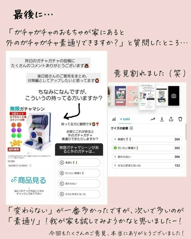 おもちゃが家にあれば外出先でガチャガチャを見かけても素通りできるかどうか、まめねこ|頑張りすぎない子育てさんがSNSでアンケートを採ったところ、「変わらない」と「素通りできる」に意見が割れたようです。