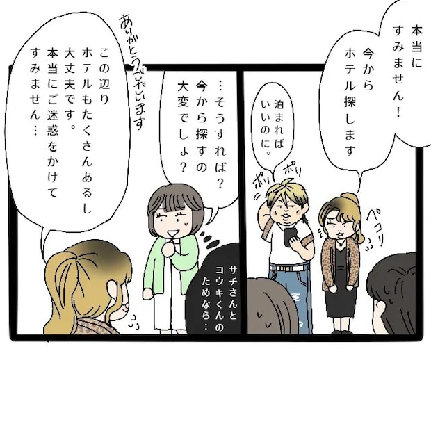 知らなかったとはいえ我が家に迷惑をかけたことを申し訳なく思い「本当にすみません!今からホテル探します」と頭を下げて必死に謝るサチさんの横で、頭をポリポリ搔きながら「泊ればいいのに」と反省ゼロの信也君。私はサチさんとコウキくんが不憫で「・・そうすれば?今から探すの大変でしょ?」と言いましたが、サチさんはそれを断り「この辺りホテルもたくさんあるし大丈夫です。本当にご迷惑をかけてすみません・・」と何度も頭を下げます。