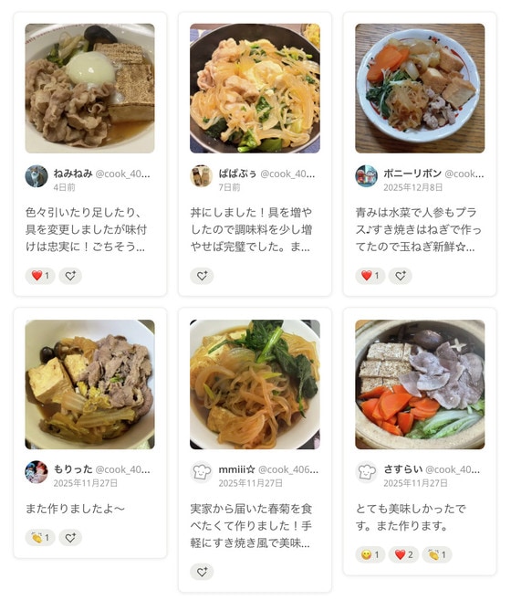 つくれぽ(みんなのつくりましたフォトレポートのこと)でも、「甘辛いすき焼き味がとってもおいしいですね〜!」「おいしくて家族も喜んでくれました!」といった声がたくさん届いています。