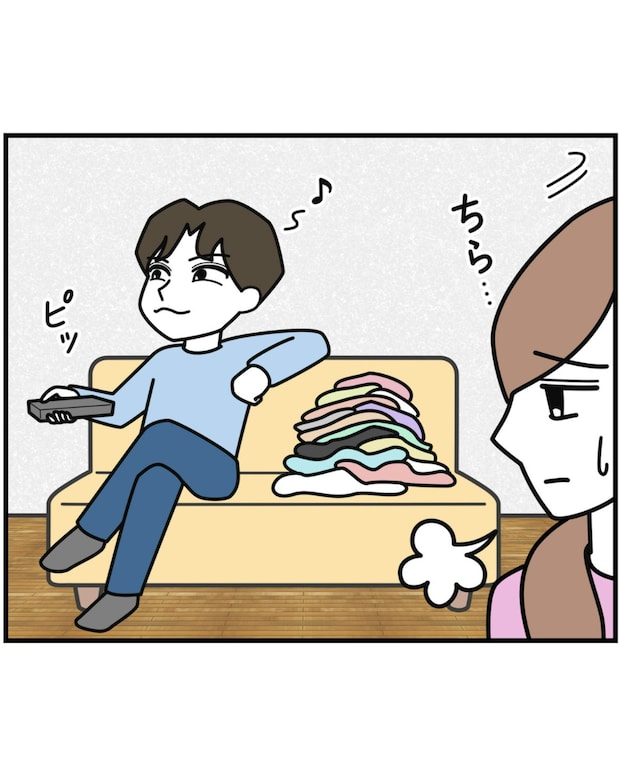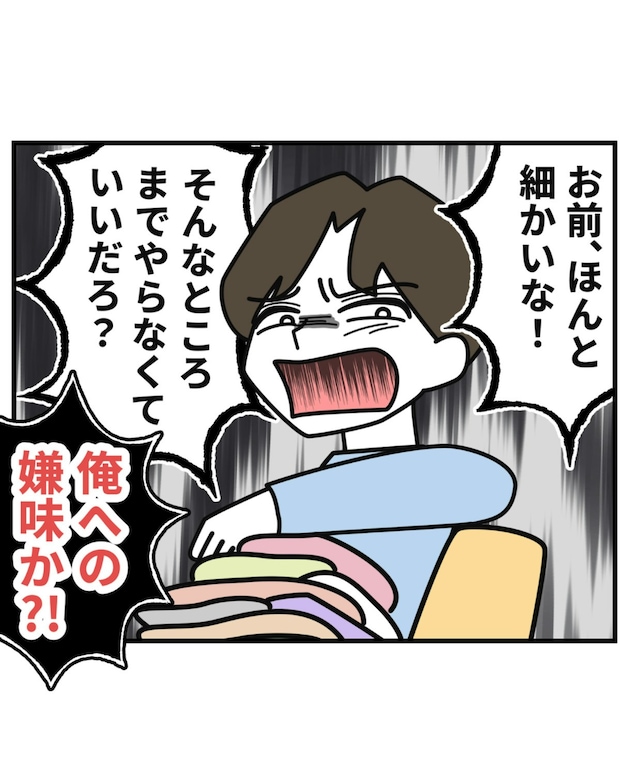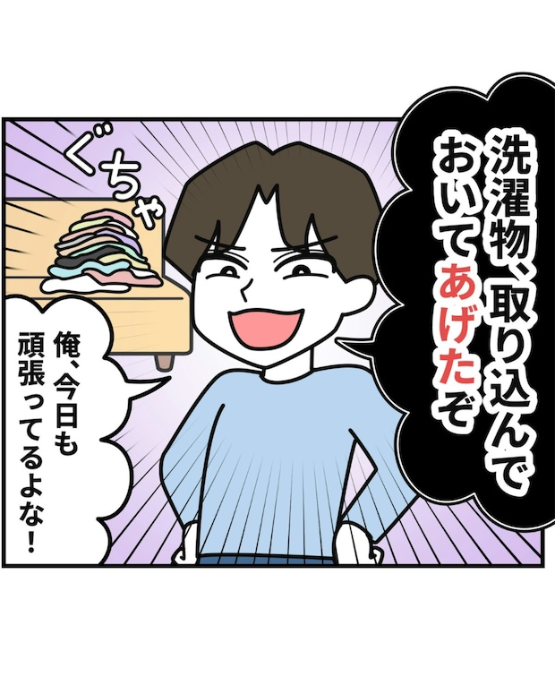 夫は洗濯物を取り込んだだけで、そのまま放置…。みゆきさんは夫に「畳んでくれると助かる」とお願いをすると、彼の態度が急変します。
