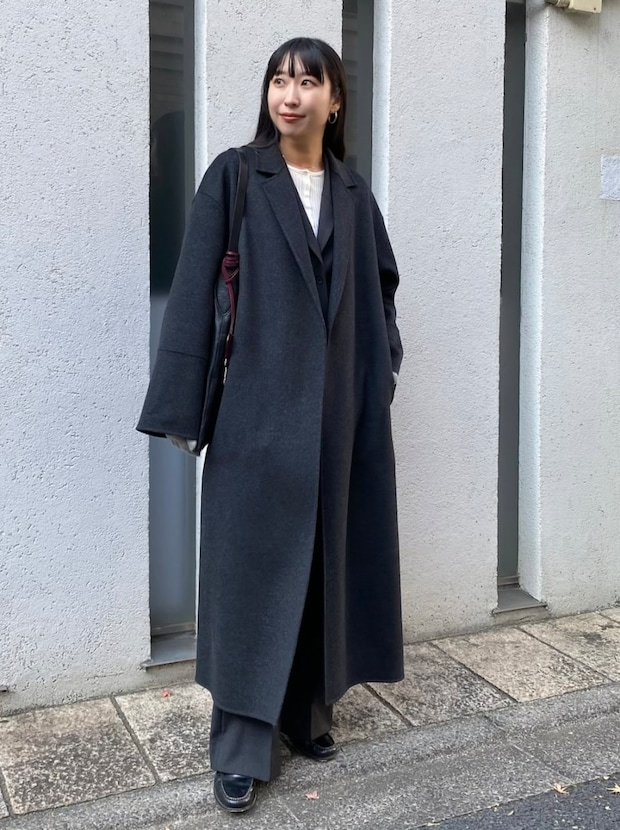 「イタリアのColombo社のカシミアコートが主役。この冬個人的にワンカラーブームなので、今回は大好きなグレーでまとめました。コートはゆったりとした素材の分量感が可愛く、シンプルながらモードなニュアンスに仕上げてくれる1枚です。中に合わせたのは着るだけでサマになるオールインワン。カジュアルさとリラックス感をプラスした絶妙なバランスがお気に入り。手元はカシミアのロンググローブで上質さをプラスしつつ、グレーのグラデーションで繋いだところもポイントです」