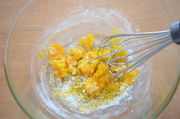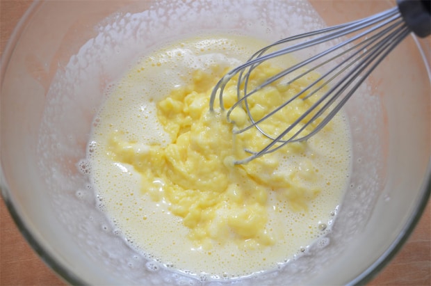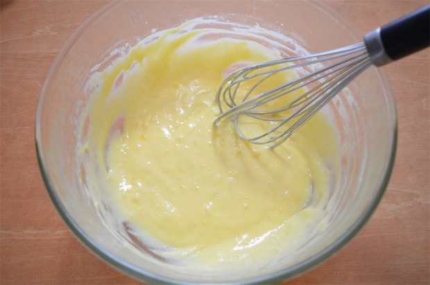 3. カスタードクリームを作る。[A]の牛乳以外の材料を耐熱ボウルに入れてよく混ぜる。そこに牛乳を少しずつ注ぎながら、よく混ぜ合わせる。600Wの電子レンジで1分加熱して、取り出したらすぐ混ぜる。この作業をとろみがつくまで3〜4回繰り返す。